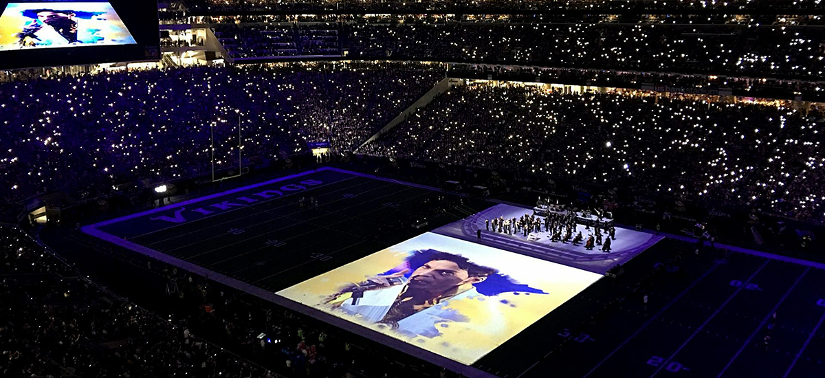 It’s a ground-breaking night: the Minnesota Vikings’ first home game of the 2016 NFL season at their newly constructed home field, the U.S. Bank Stadium in Minneapolis. As the half-time show begins, the stadium is bathed in purple light and the first strains of music begin. The Minnesota Orchestra, along with members of Prince’s New Power Generation and gospel group, The Steeles, perform late hometown popstar Prince’s iconic hit, “Purple Rain”.