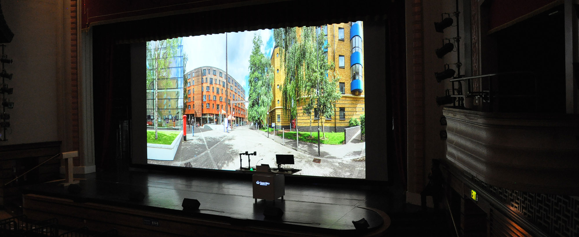 The screen is an impressive 12m by 6m (39 ft x 19.5 ft) and is located in The Great Hall, an 800-seat space in a wonderful 1930s art deco building. Queen Mary University is a Russel Group university, with more than 25,000 students, so investing in advanced technology to further their students’ learning is a key consideration. Because it is rented to large external companies as well as used for students, it is an important source of revenue and having world-class audio-visual technologies is imperative.