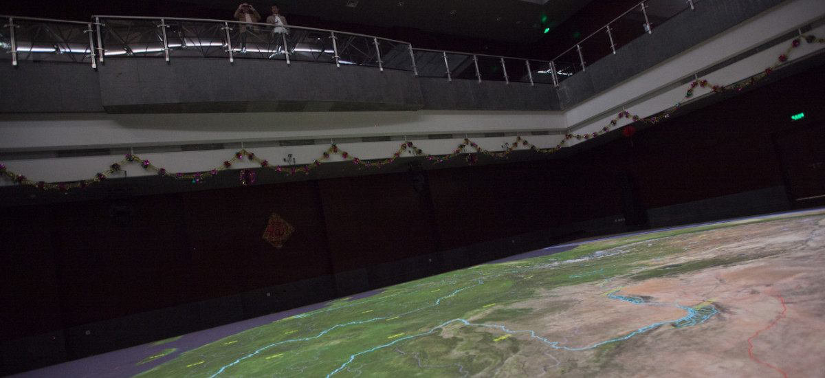 布置成2x2的融合型向下投射阵列,可产生高质量的画面,此解决方案提供了8 m px的分辨率和令人惊异的中国地形图。在三楼天桥上可以鸟瞰下面的测绘数据,可给人深刻的印象。这种前沿解决方案可帮助中国各省的防灾。