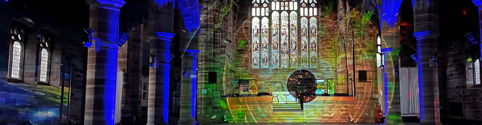 科视Christie 投影机安装在由活动策划制作公司 Adlib 负责搭建的高大桁架上,约两米高,并调整至可准确映射教堂所有砂岩柱与天顶。配套灯光包括一个 3 瓦 RGB 主激光器,通过 Pangolin Quickshow 激光灯控制软件连接时间码,并运行音频轨道,还有两台六头 3 瓦 RGB 激光条、一台 2 瓦 RGB 星芒(starburst)激光器及四个较小激光器,以引导观众入内观看。摇头光束灯与建筑灯光由 Avolites Titan One 灯控台控制。Paul Alty 还请其学徒 Josh Thornton 充当技术支持,以便自己有机会在表演中更多露面,与参观者们互动交流。