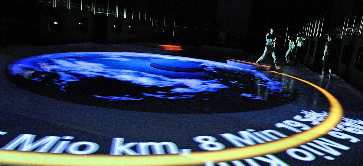 The 2014 Fraunhofer prize award ceremony (held in Freiburg) focused on the interplay between energy and innovation. The host duly proclaimed the annual conference slogan to be: “With new energy”, and the 700 invitees from the financial, political and research sectors at Freiburg’s Konzerthaus could take these words literally: The centrepiece of the show was a stunning, 15 x 20 metre ground projection that could be walked on and was lowered to 4 metres below the spectator level. It was achieved using a combination of pre-recorded and interactive video content, supported by live performers. The interaction between the projection and the performers achieved extraordinary effects. It was an artistic way to bring the public, who were watching around the projection area, closer to the presented research projects.