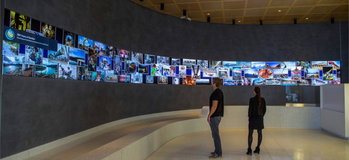 Comprising a total of 160 Christie MicroTiles, the curved wall sits atop a superstructure pedestal custom fabricated by rp Visual Solutions and stretches 58’ long. Officially named the Digital Arts Panorama, the video wall is controlled by a custom content management program developed by the Obscura Digital team which allows the SFPUC communications department to upload and manage information on the wall effectively and efficiently.