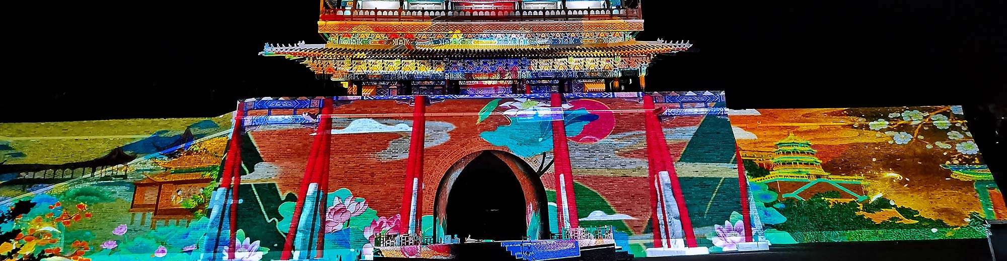 科视D20WU-HS 和 D13WU2-HS 投影机安装在俯瞰古城楼的放映室中,可以展示一系列 74 米宽、30 米高的视觉效果。赢康科技进行了视角视场分析,以确定投影画布的建筑特征,确保影片在不同形状、不同材质、不同底色的载体上和谐一致。城门上方还安装了纱幕投影方案,确保影像不会因城门周围的空心空间而变形。