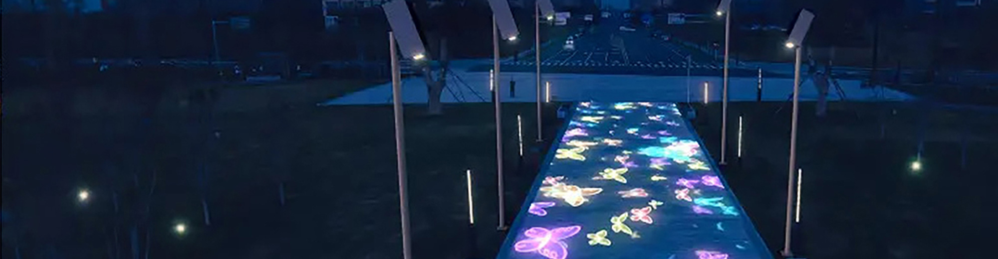 这个位于伊滨区中轴带智慧化建设项目的崭新照明项目旨在为游客提供令人兴奋的夜游体验。该地面投影部分由科视Christie 的合作伙伴北京光影创意科技有限公司负责设计、投影机选型、安装调试施工、互动内容制作以及后端的控制。北京光影创意科技团队战略性地安装了十多台科视Christie LWU1260-DPS 激光投影机,打造出具有互动元素的迷人地面投影。