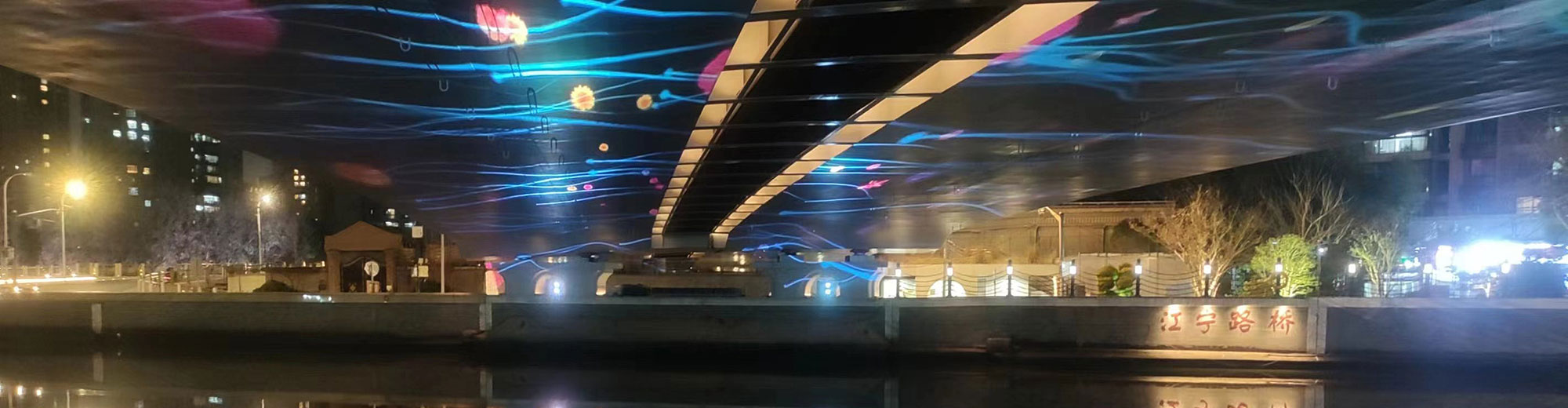 然而,江宁路桥底面为光面,反光严重,为项目增加了障碍。为了解决这一问题,团队采取了多种措施:包括使用磨砂漆减少反射,更改镜头以优化投影效果,并在关键点位策略性地堆叠投影机,确保画面亮度一致。此外,为了抵御河边的潮湿环境,还使用了定制户外恒温箱来保护投影设备。