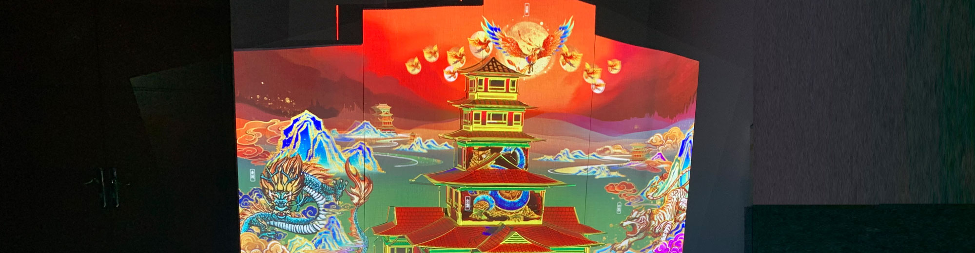 创意展区带来的是一场迷人的中国风实景演艺3D投影秀,它在一座长 6 米、高 3 米的仿古塔楼模型上进行。这场投影秀配置了四台专为中国市场研发的 20,600 流明科视Christie DWU2022-HS 1DLP® 激光投影机、科视Christie 潘多拉魔盒以及科视Christie Mystique。该投影演示突显了科视Christie 集成解决方案的优势,是最近在广州和南京的路演中的明星展项。在展会上,该投影秀无论从设备配置和演示内容,都进行了重大升级,将让大家耳目一新。
