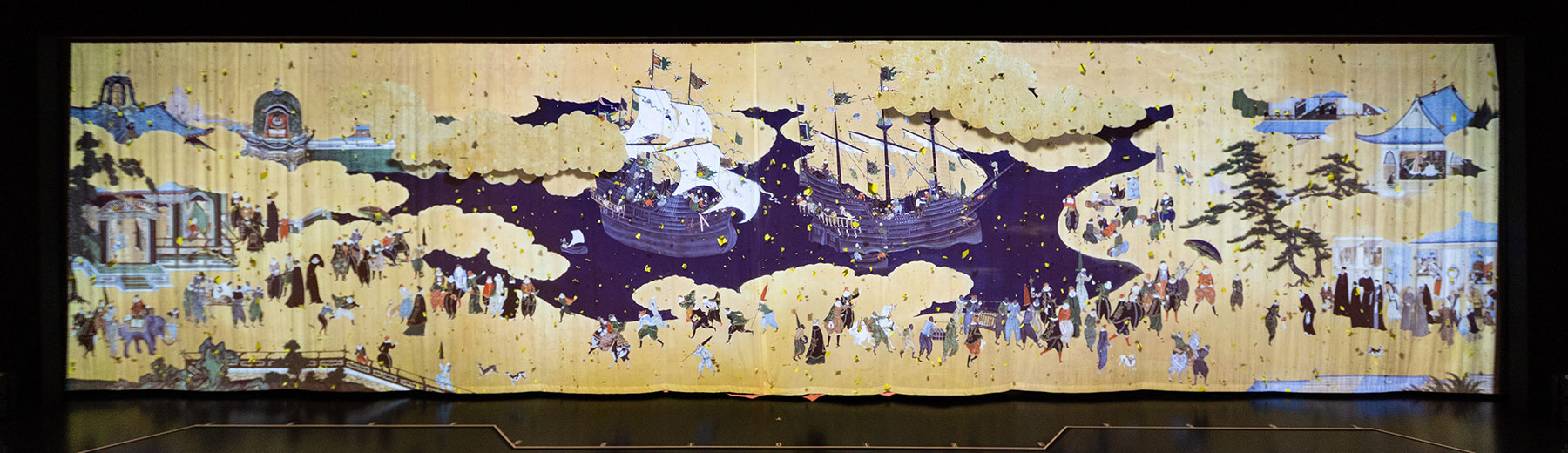 内容设计公司 Naked Inc. 根据 15 世纪日本著名画家狩野内膳的作品《南蛮屏风》为数字幕布创作了显示内容。这种风格的屏风画源自于 16 世纪末的安土桃山时代,描绘了从西班牙和葡萄牙等地的港口抵达日本的绚丽多彩的外国船只、建筑和人物。